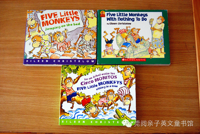 Eileen Christelow的书,也是相当喜欢。著名的五只猴子的故事啊!看图片中就知道米妈不是一批次淘的,三本书三种版本,可见再版次数N多。小米最喜欢这几本书,我也最喜欢和小米读这几本书,因为基本上我只要负责翻书,内容全让小米给抢着读了。《Five little monkeys jumping on the bed》和《Five little monkeys sitting in a tree》是小米在幼儿园里学过的手指谣,现在可以一边念手指谣,一边看书中的图画,小人儿觉得实在是开心不过。尤其是《Five little monkeys sitting in a tree》,即中文童谣版的“五只猴子荡秋千”,我们曾经都觉得这首童谣挺血腥的,因为鳄鱼把五只猴子都给吃了。其实书中有着完美的解释,小猴子们没有真的被鳄鱼给吃了,只是躲在了树上。当然最后五只猴子也被妈妈批评了,不能嘲笑鳄鱼,这是很不礼貌,而且很危险的事。书中妈妈在批评小猴子时,鳄鱼趴在岸边笑眯眯地看着,那副神态太让人喜欢了,完全就是幸灾乐祸啊!