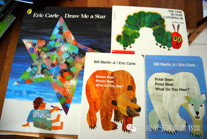 比如Eric Carle,卡爷爷,超级名家中的名家啊!他独一无二的拼贴画(Collage)风格,鲜亮的色彩,以及专门为低幼儿童画的内容,还有那些朗朗上口的韵律,都深深地吸引着我和小米。比如他的经典书《Brown Bear,Brown Bear,What do you see?》,内容很简单,一遍遍地重复着“......What do you see? I see a ......looking at me”,一个动物一个动物延展开,基本可以说没什么太多内容,却因为这些不断重复的,读起来朗朗上口,仿佛是读诗一般的句子,而让整本书生动起来。姐妹篇《Polar Bear,Polar Bear,What Do you Hear》,同样有着这样的特点。而那本《The Very Hungry Caterpillar》,著名的《好饿的毛毛虫》一书,更是受到全世界的喜爱。我一直坚持着没买中文版,就是觉得这里面的句子,还是得读英文的才好听。而在随着毛毛虫长大的过程中,把周一到周日的英文单词就全都学会了。强烈推荐卡爷爷!