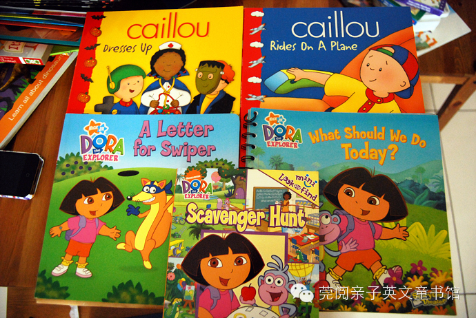 与孩子熟知的动画片相关的英文书,我也淘了很多。比如caillou和dora,以前就各淘了十来本,这一次在书市上偶然看到,同样是淘来没商量啊!