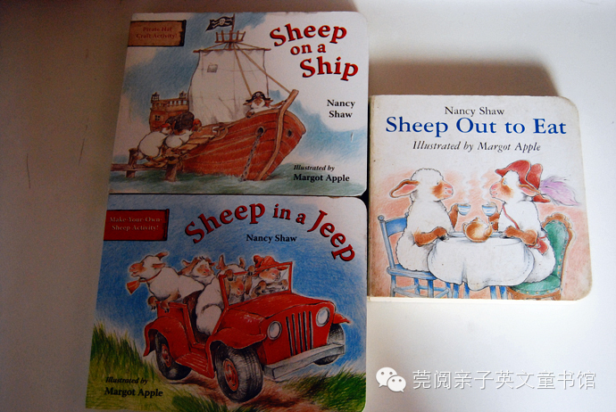 Nancy Shaw,她的滑稽冒险小羊系列,是童书中的常胜军,得奖记录不断。小羊们四处去冒险,而又不断地发生一些有趣的事,哪怕是出去吃个饭(《Sheep out to eat》),也是状况不断。最让我喜欢的是,Nancy Shaw(也称为Nancy E.Shaw)用她独特的押韵方式,以最简单的词句来说故事,读完了书,也就认识了那些读起来相近、意思却不同的单词。单看这几本书名就可窥见一斑了。比如《Sheep on a Ship》一书中,小羊们去海上航行,可是都出了什么问题呢?“It rains and hails and shakes the rails......Sheep read a map,but begin to nap”。。。。。朗朗上口啊!还记得读初一时,学单词,老师说sheep 和jeep的区别,滔滔不绝说了很多,可是如果我们读完了《Sheep in a Jeep》,还怎么可能把这两个单词的意思弄混呢?