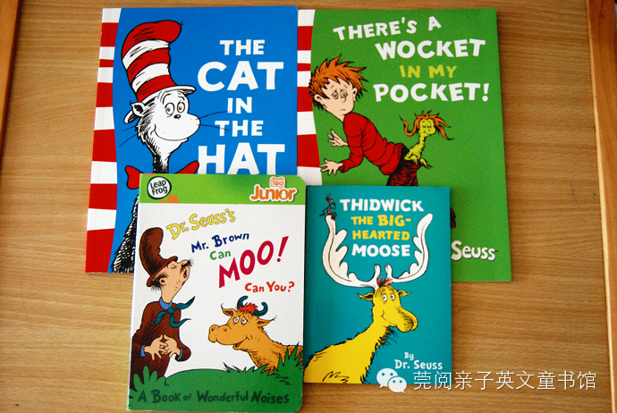 Dr.Seuss,相信不用介绍了,同样是超级名家啊!他的图画书有着典型的个性化风格,明亮的色彩、简洁的线条、夸张的造型,配合原创的动画形象以及曲折、生动、紧凑的故事,而文字读起来也同样是韵律十足。比如《The cat in the hat》一书中仅用了236个字汇,就将一个百无聊赖的下午变得紧张刺激,用一只猫把孩子们带入各种各样搞怪的把戏中。苏斯博士的书中最常见的就是文字游戏,他会先介绍两个单字,然后再利用这两个单字创造出简单的句子,比如:Day.Play.Weplayallday.Night.Fight.Wefightallnight。许多父母都喜欢给孩子读苏斯博士,帮助孩子语言入门及强化语言学习。我也同样如此。买过双语版的苏斯博士套书,但还是更喜欢淘这样的原版书。