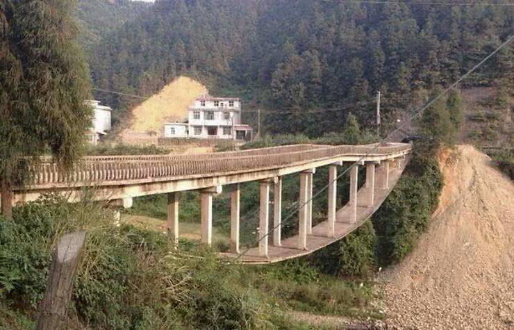 中国设计师吴琦瑛先生建造的,位于中国湖南的洞口县的淘金桥。从图上可以看出,淘金桥造型十分奇特,它与一般拱形桥的构造正好上下颠倒,感觉就像设计师拿反了图纸一样。不过,淘金桥却是吴琦瑛深思熟虑的结果,它比一般的拱新桥多出了两点优势。