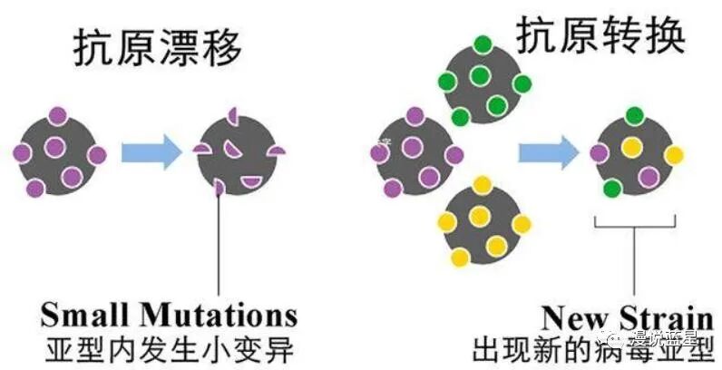 流感病毒的另一个进化动力是抗原转变。当两种不同亚型的甲型流感病毒感染同一个宿主时,可能会有节段之间的交叉和重组发生,组合出新型病毒。这一过程叫作“重配”。“重配”可能会造成流感病毒表面糖蛋白(HA、NA)产生较大的改变,这样现象称为“抗原转变”。