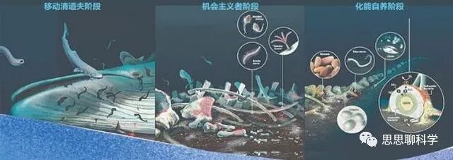 机会主义者借机繁衍的同时,海底大量的厌氧细菌开始进入鲸骨,分解在其中的深厚脂类,这些分解后的脂类将会溶解在海水中,与其中的硫酸盐产生化学反应,硫化氢自此产生,而大量的海底自养细菌就依靠着这些硫化氢作为能源,获得能量。以此作为基础,一座生态系统开始缓缓诞生。对于细菌来说,这才是真正的开始,因为依此而生的细菌在未来的几十甚至上百年中,都可以衣食无忧!