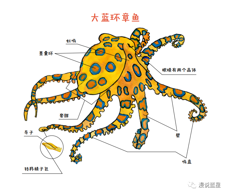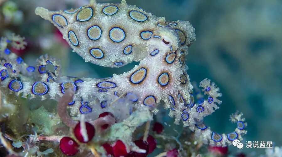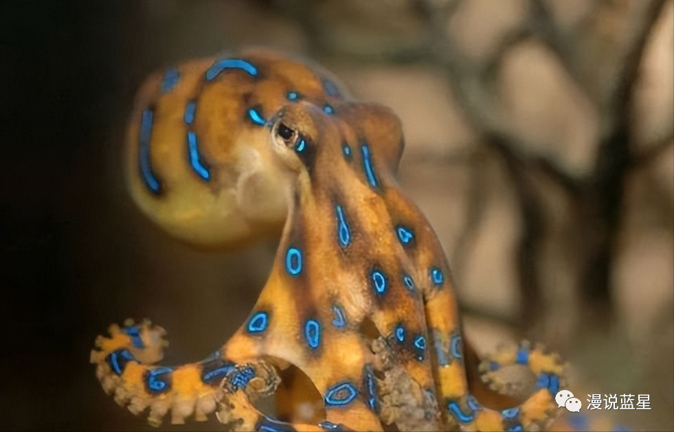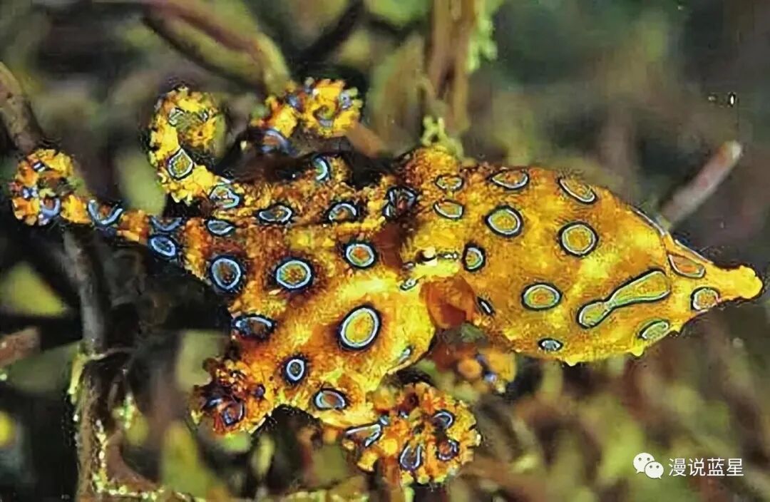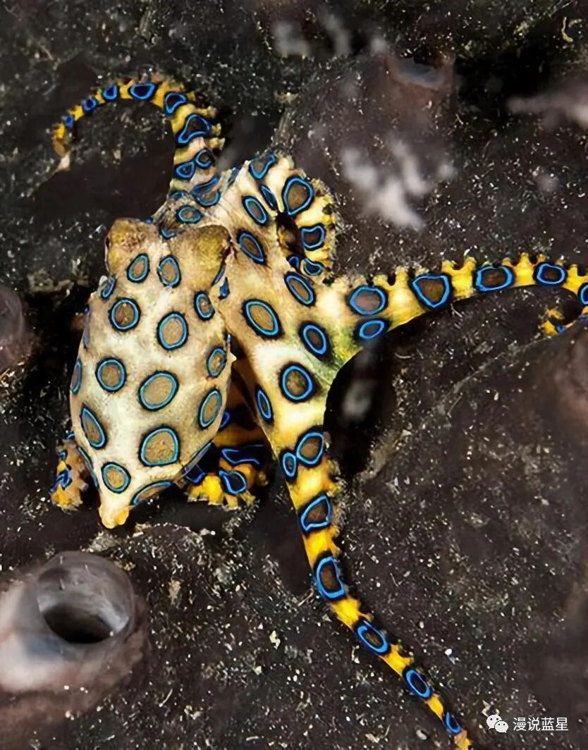 为什么它可以轻松变色呢?这是因为蓝环章鱼的皮肤下有众多色素细胞。这些特殊类型的光反射色素细胞,能够使身上的蓝环呈现出虹彩,蓝环章鱼通过收缩或伸展,改变不同颜色细胞的大小,就会让模样发生改变。