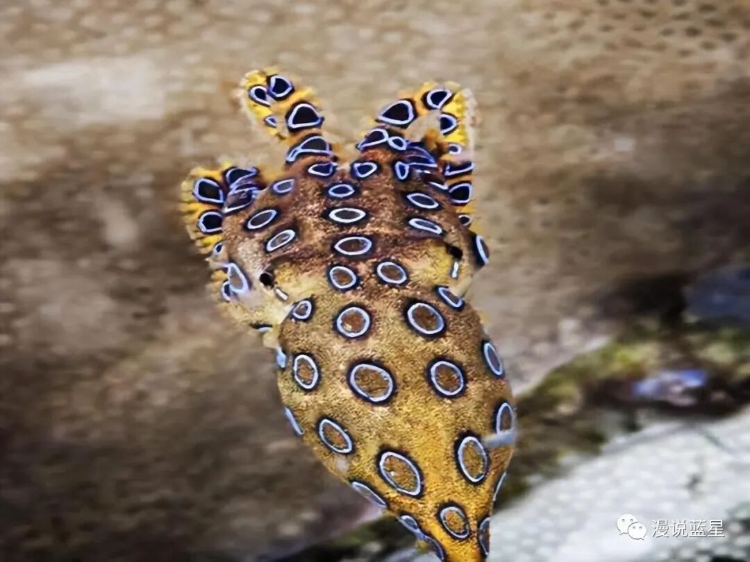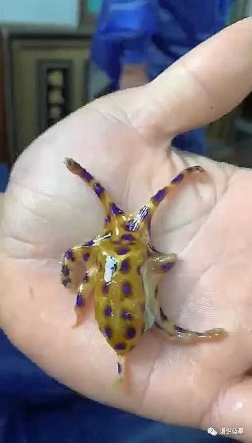 蓝环章鱼是一种极具毒性的海洋动物,其体长完全伸展时不超过15厘米,大约只有成人手掌大小。周身布满青蓝色斑点,外表相当美丽。当其在海中缓慢前行时,宛如穿着散发闪闪荧光的豹纹衣饰,所以又被称为豹斑章鱼。