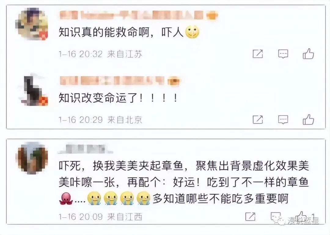 不仅如此,蓝环章鱼所含的河豚毒素是不会在高温状态下被分解的。因此,就算被下到火锅里煮很久,只要被吃下去,还是会导致进食者中毒。并且毒素会在火锅汤里分散,导致所有进食者中毒。可以说,这位网友的好奇不仅让自己免于一难,也救了同桌的其他人。网友们纷纷评论:真的是知识改变命运啊!