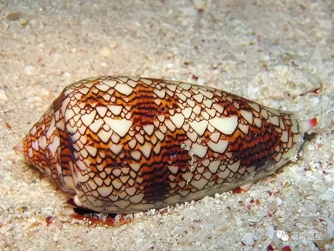 芋螺又叫鸡心螺, 因其形状像鸡心或芋头,故得此名。最大的个体长达23厘米。壳面有各种花纹和斑点,十分多彩,非常符合海中生物越美丽越危险的定理。身体尖端部分隐藏着一种既是舌头又是牙齿的"鱼叉",可射出毒液。一只芋螺的毒素足以杀死10个人,被其刺伤后会产生剧烈疼痛,受伤部位严重溃烂,医治不及时会造成心脏麻痹和心跳停止。