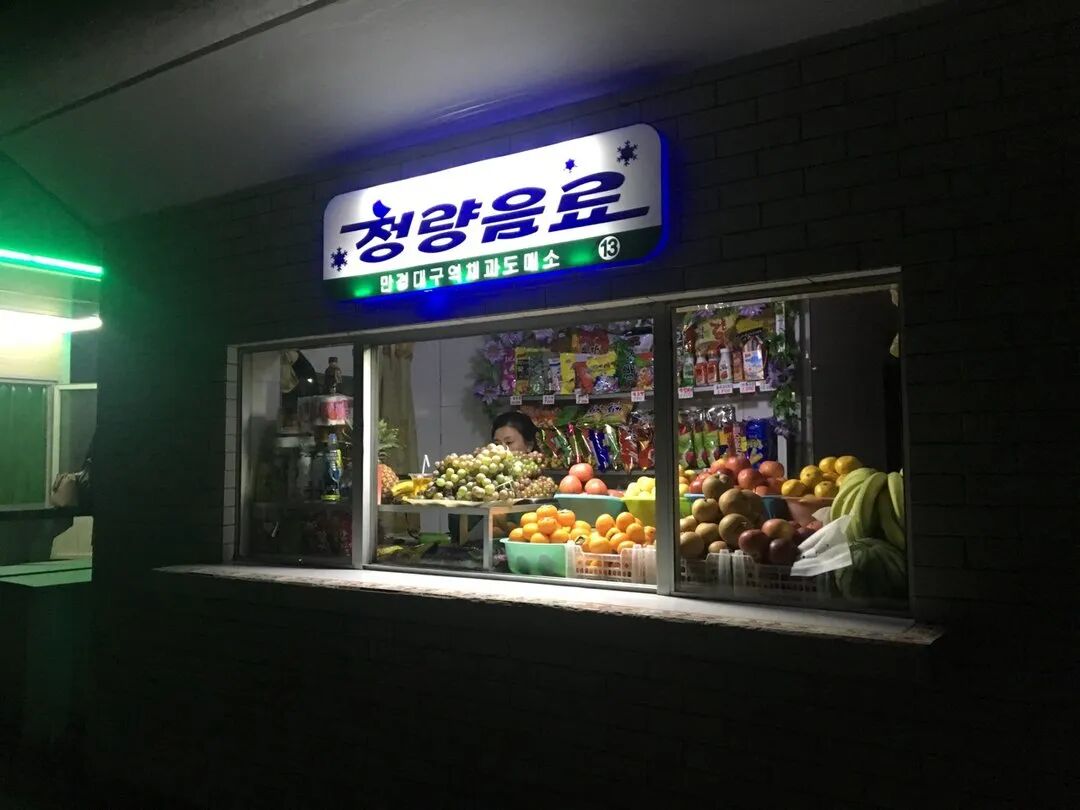 我说,是的啊,不管是西瓜啊、苹果啊、还是梨都比朝鲜便宜。我们走着走着,眼前亮了起来,放眼望去,前方一盏盏路灯格外刺眼,路灯旁边是一排排整齐的高楼。我知道这个地方是仓田街,以前在平壤当交换生时,我经常来逛仓田街。