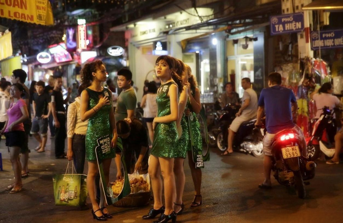 过道上穿超短裙的越南女孩坐在凳子上,一边打量经过的男人,冷不防会朝男人们招手,吹口哨,甚至吐瓜子壳。还有不少越南女孩穿黑丝袜,冲经过的男人搔首弄姿。这些越南女孩大多二十岁左右,有些看起来才十五六岁。