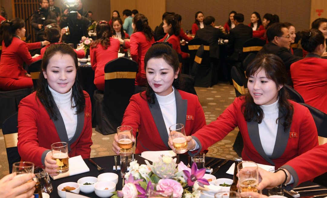 从这方面来说,劳力士男人确实勇气可嘉,居然敢光明正大追求乐团美女。我们这桌还是分成两个阵营。朝鲜人和朝鲜人一起喝酒,中国同胞和中国同胞一起喝酒。