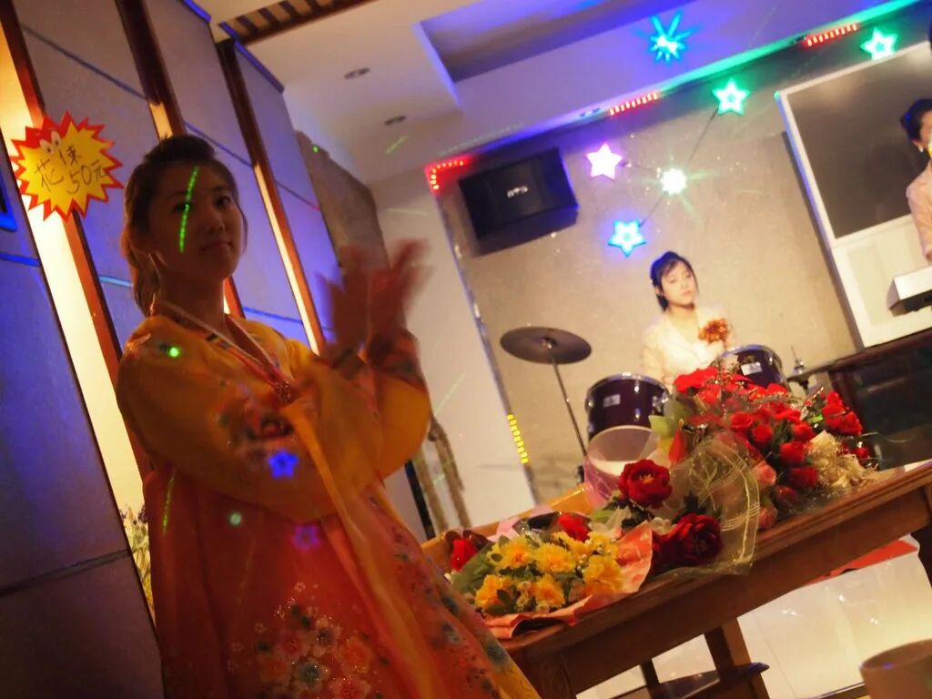 我和老包一边聊天一边探讨怎么搞钱,吧台上朝鲜姑娘的节目表演,我们并不敢兴趣。我们吃到一半的时候,一名朝鲜姑娘在吧台上宣传,在场的客人可以买鲜花送给喜欢的姑娘,送花以后,可以和姑娘们一起跳舞。