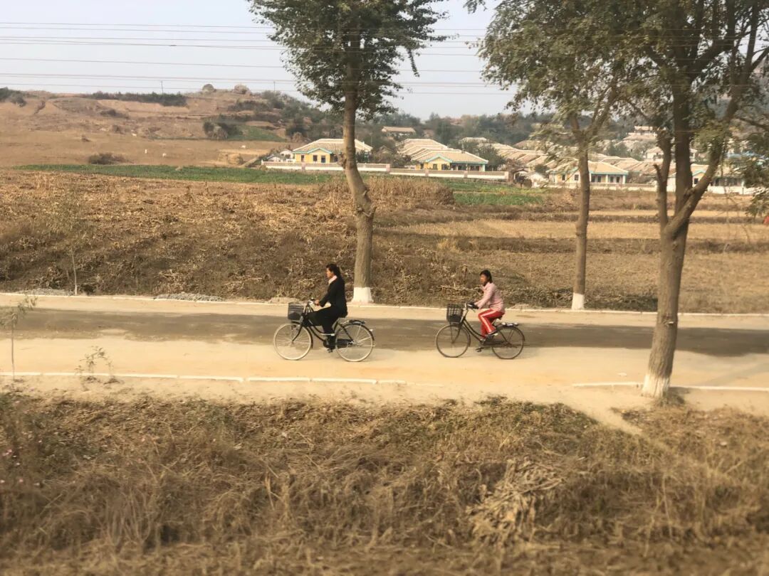 上午十点多,太阳升高了,路上依稀能见到行人。有的人骑着自行车,有的人牵着黄牛,有的人开着手扶拖拉机。空旷的农田里,运送肥料的人多了起来。朝鲜农民的生活看起来有些清苦,但他们没有太多的烦恼。