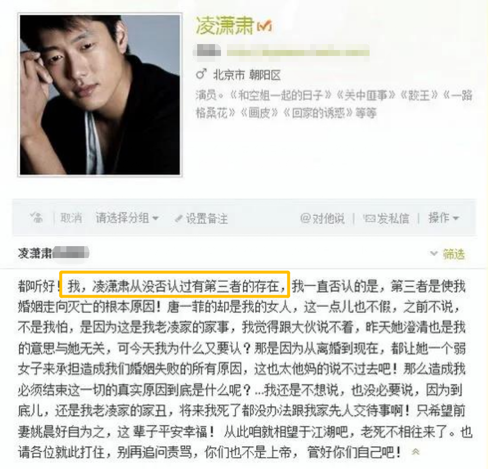 为了维护女友的声誉,凌潇肃还亲自发文为唐一菲说好话,结果越帮越忙,他那一句“从没否认过有第三者的存在”,彻底坐实了唐一菲的小三身份。