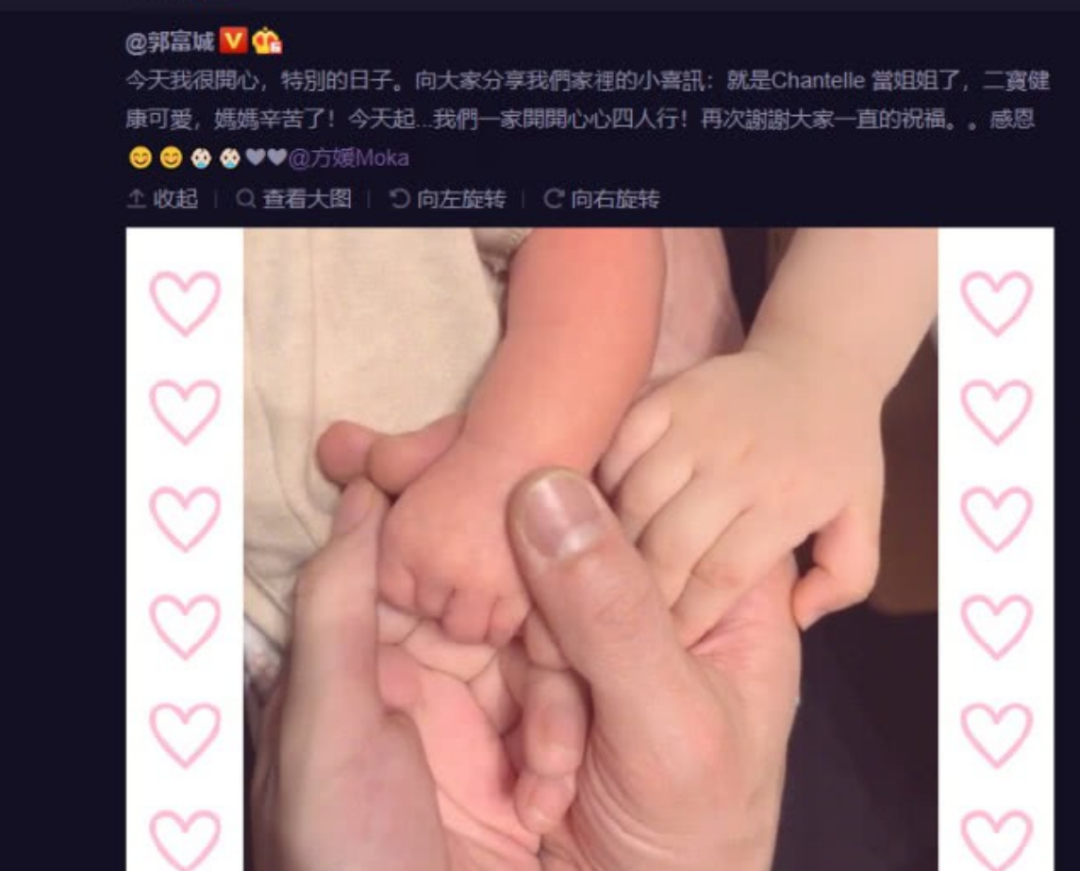 在婚后第三年,方媛又为他生下了第二个女儿,小女儿出生当天,郭富城不仅晒出了一家四口手握着手的照片,还发文和大家分享了他的喜悦。