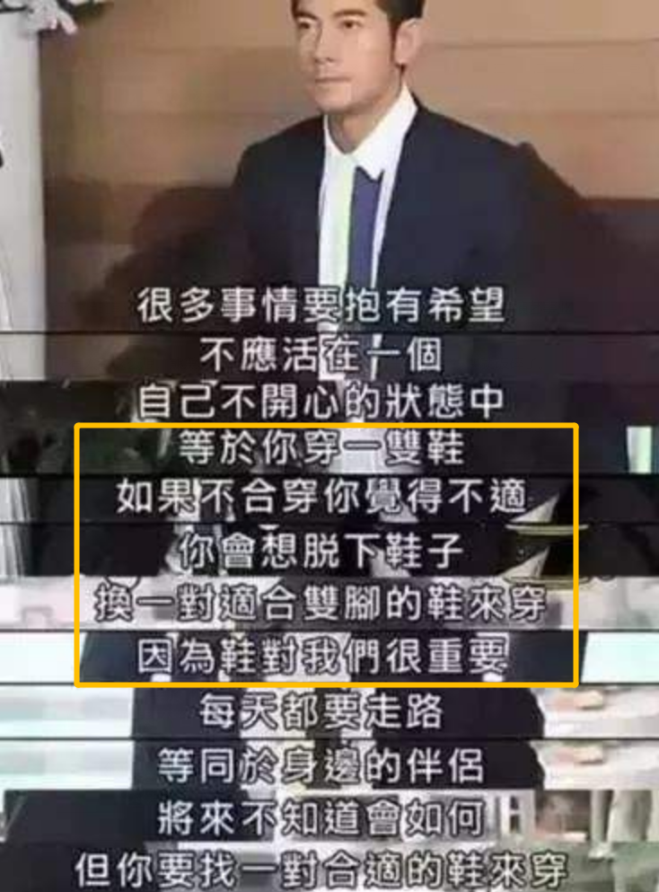 不过和之前的那些绯闻女友不同,之前郭富城和其他人都是好聚好散,和熊黛林,他却当着媒体的镜头说了这么一番话:“等于你穿一双鞋,如果不合穿,你觉得不适,你会想脱下鞋子,换一双适合双脚的鞋来穿。“