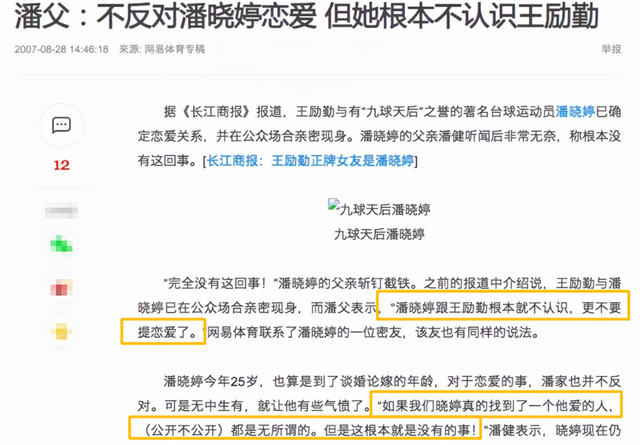 因为此事备受困扰的潘晓婷,最后亲自出面否认了此事,她父亲潘健在接受采访的时候更是直言:“她和王励勤根本就不认识,更不要提谈恋爱了!”