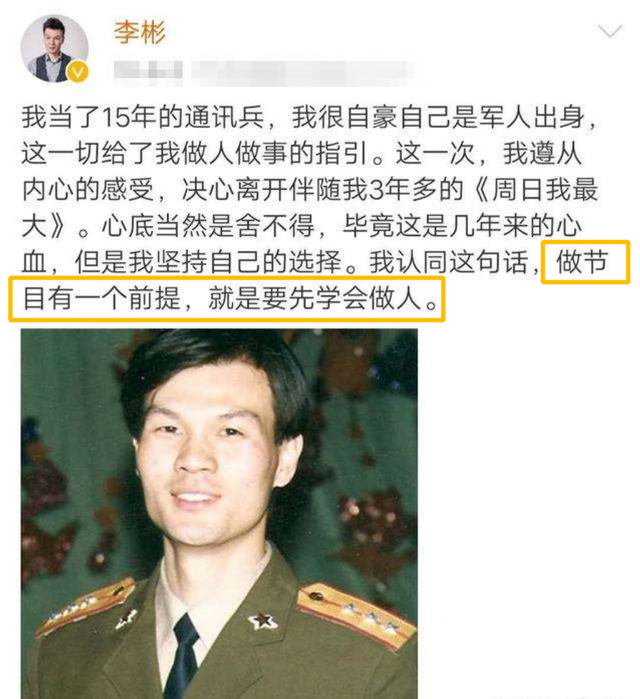 之后不久李彬就离开了安徽卫视,由于离开时他在社交平台发文称:“做节目有一个前提,就是要先学会做人。”