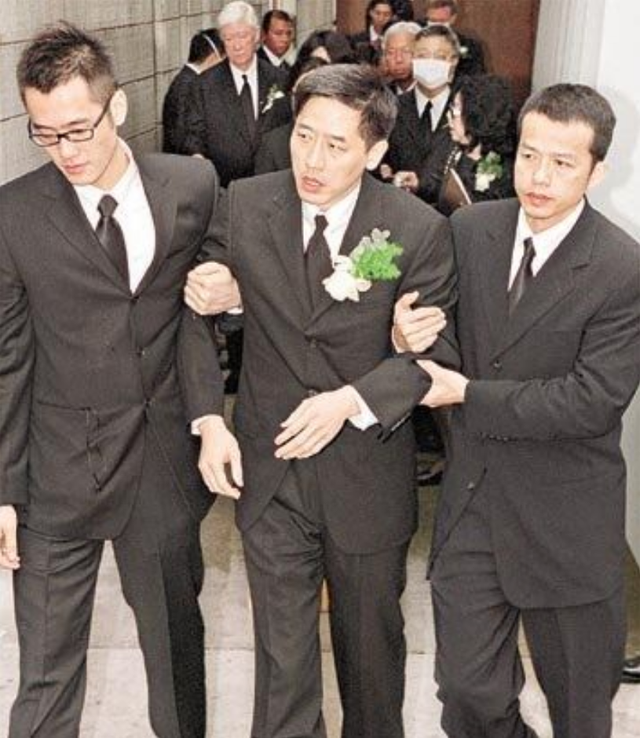 后来在张国荣的葬礼上,他身穿一身黑服,泪流满面的在别人的搀扶下,以“张国荣未亡人”的身份参加了他的葬礼。