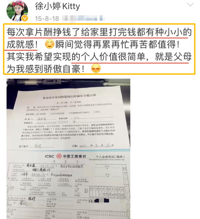 以至于每次给家里汇钱的时候,她都感到特别开心,她甚至曾在社交平台上发文表示:“每次拿片酬挣钱了,给家里人打完钱都有种小小的成就感!”