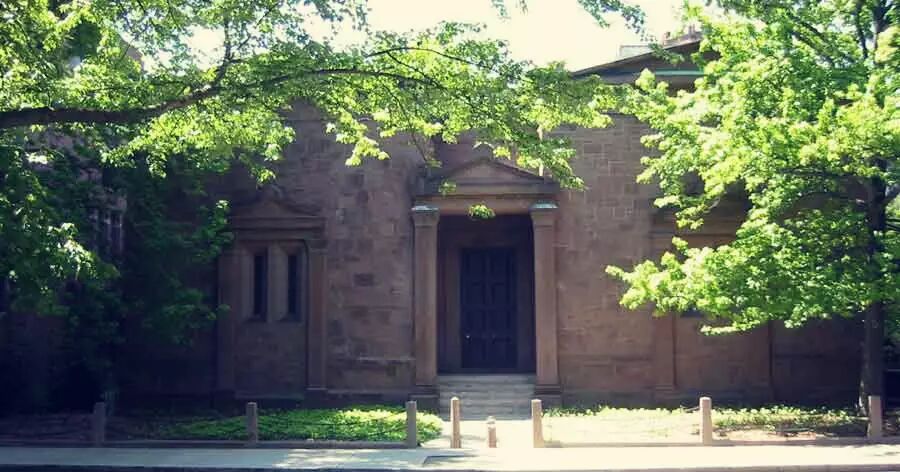 9月踏访耶鲁时,我决定去探访一下“骷髅会”被称为“墓穴”的总部。大概是那天阳光明媚,那座楼没有表现出阴森的样子,却冷冷的。“穴址”位于高街(High Street)第64号,地处耶鲁校园特别核心的位置。从老校区的门一出来,街对面正对着的就是,与耶鲁大学美术馆毗邻,和英语系大楼临街对望。这是一幢有一百多年历史的希腊埃及式褐色砂岩石楼,三层楼高,带有阁楼。它的石墙上果然如很多文章里所描述的那样,仅有很窄很暗的窗户,根本看不到里面。事实上,如若不是窥探者,我想是不会想到要走近它的:和这条街上的其他建筑不同,这座楼不是直接临街的,而有一片并不宽阔的前院,需要穿过前院的小径,才能到达它深凹进去的大门。更何况,那些狭窄的窗户都很高,超出了一般人视线可及的范围。在耶鲁大学书店里,我找到唯一的一本写“骷髅会”的书,叫《墓穴的秘密:骷髅会,常青藤和权力之路》。书的作者是《纽约客》撰稿人、耶鲁毕业生亚历山大•罗宾斯(Alexandra Robbins),她本人也曾是一个耶鲁秘密社团的成员。她既是耶鲁校友,又是秘密社团成员的身份,使她能匿名采访到很多“骷髅会”的成员,阅读到耶鲁大学图书馆关于“骷髅会”的文献档案。她这样描写“墓穴”的内部:“墓穴里堆着很多东西,里面就像个多层楼的储物空间,到处都是些驼鹿头、蜡烛、套着盔甲的骑士模特、鹿角、中世纪的艺术品、老照片、手稿等的混杂物。有一套俄式的茶壶,有一尊大象背着的佛像,一口装满毛织毯的箱子,一尊希腊雄辩家德摩斯梯尼的小雕塑。很多物件都是‘骷髅会’校友的赠品,看上去就像个维多利亚时代有收藏癖的人的家”。骷髅会大楼有一个房间被称为“德国屋”,“摆满了德国的古器物,很多早于普法战争,房间内暗色的木墙上刻着德语词。墓穴内的一幅画上描绘了一个敞开的墓葬:四个骷髅躺在石板上,周围放着一顶小丑帽,一本打开的书,几件数学仪器,一个乞丐的袋子,还有一顶皇冠。下面有一行字:‘谁是傻子?智者,乞丐,还是国王?无论贫穷或富贵,死者皆平等’”。这些内部装饰,表明了“骷髅会”最初的德国渊源,虽然如今它与德国的联系早已不复存在。时间与死亡是“墓穴”里内饰的主题。墙上有一处刻着拉丁文“Tempus fugit”,意为“时光飞逝”;墙上挂满了人、麋鹿和野牛的骷髅;一面墙上挂着一幅题为《死亡与拿破仑》的彩色木版画;门厅放着一块匾,刻着“Memento mori”(记住你必将死亡)。一位20世纪70年代的“骷髅会”成员这样解释“墓穴”里的死亡意向:“这不是关于恐怖,而是一种让人在年轻时体验到存在之有限的环境”。不断被提醒的死亡,让成员们意识到,他们并没有太多的时间来成就自己,必须要抓紧。成员聚会的时间是每周四和周日晚7点55分;按照“骷髅会”的计时方式,则是整八点。“骷髅会”有意把时间调快了5分钟,让“墓穴”里的时间与外面世界的时间有所不同。