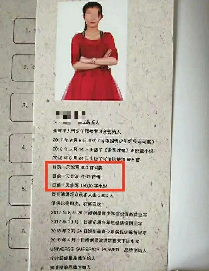 是的,我要提到的正是前几天上了热搜的一则新闻:一个16岁的女孩,声称可以一天“写300首词牌,写2000首诗,15000字小说”。在媒体随后的采访中,女孩表示是在一个不愿透露名字的学校组织的挑战赛中,完成了八个半小时写100首诗的任务,在此后的一次大考中,她又完成了24小时写2000首的挑战。她的父亲岑岷峨,坦言“没有在说词有多精湛多么好,他们是以灵感即兴发挥的,可能不加修饰,就是以电脑打字的方式,谁能打字更快一点。”