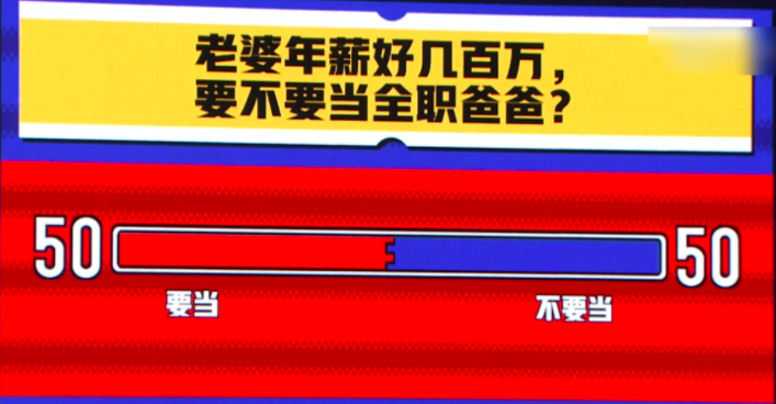 为什么现场嘉宾一个个都瞠目结舌、大跌眼镜?仅仅因为平票很稀奇?我拖着进度条前前后后看了几遍,最终在李诞那个“你们这些不要脸的”里摸出点门道,原来很多人的惊讶,是没想到愿意当全职爸爸的比例有这么高。
