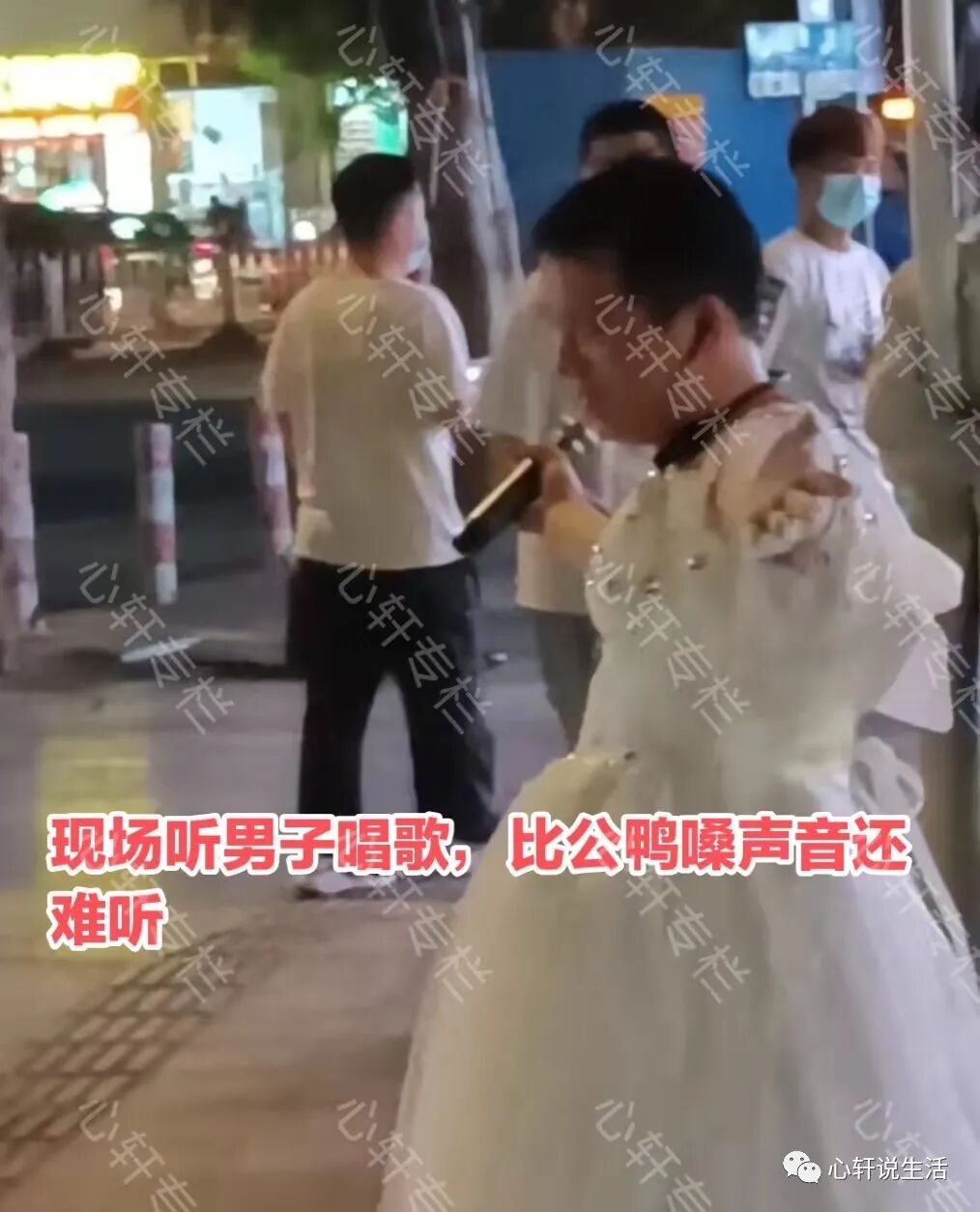现场的他,除了扭动自己的粗腰以外,更是唱出了三五不着调、公鸭嗓声音的歌曲,路人的围观者有些已经叹气,有些已经自言自语对他发出谴责的声音。