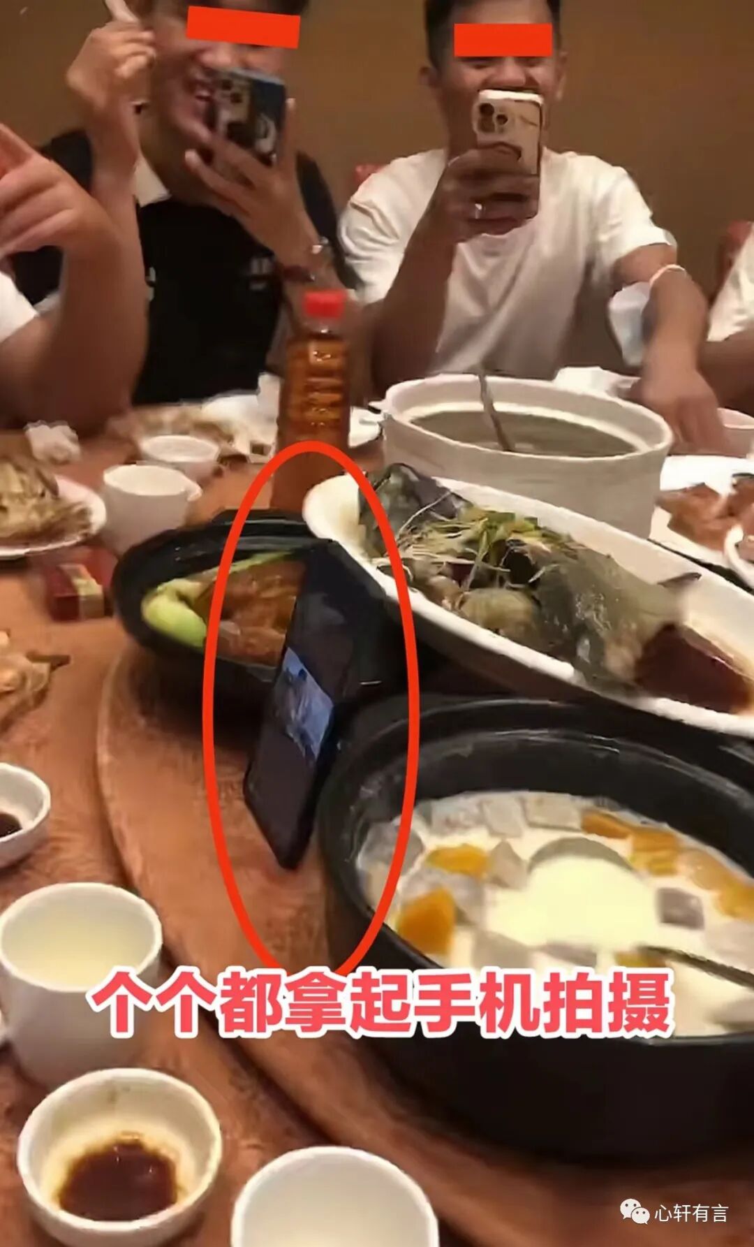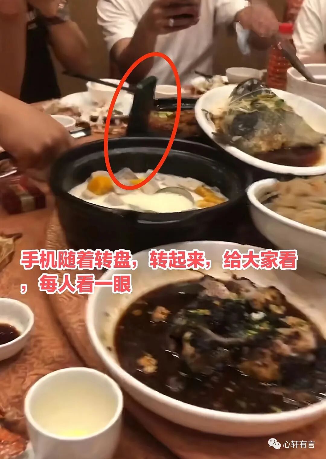 离谱的是,这部放着影片的手机,随着餐桌的转盘,在旋转,这一桌人都有份,而且还是轮着看,只限每人看一眼。