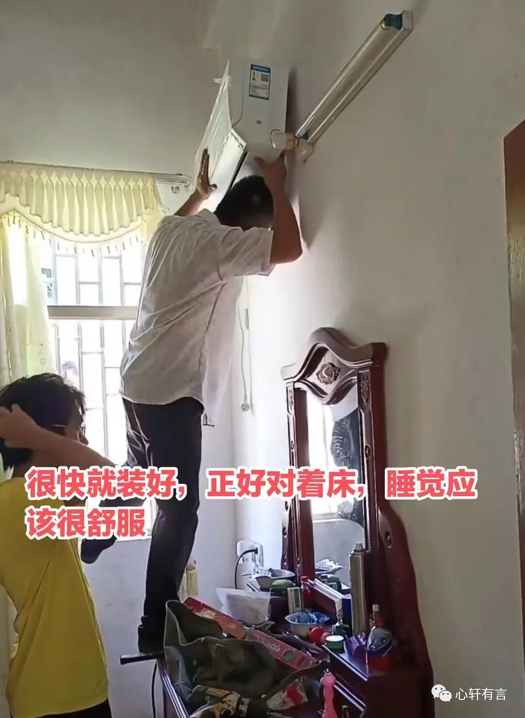 等这一系列动作完成之后,她才让师傅在墙壁上面钻洞安装空调。