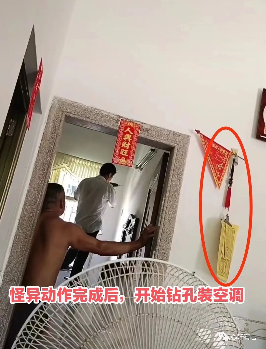 但是,在装空调之前,女子父亲做了一系列的怪异动作,先用脸盆装点水,再用一种不明的叶子沾点水向需要安装空调的位置先洒点水。
