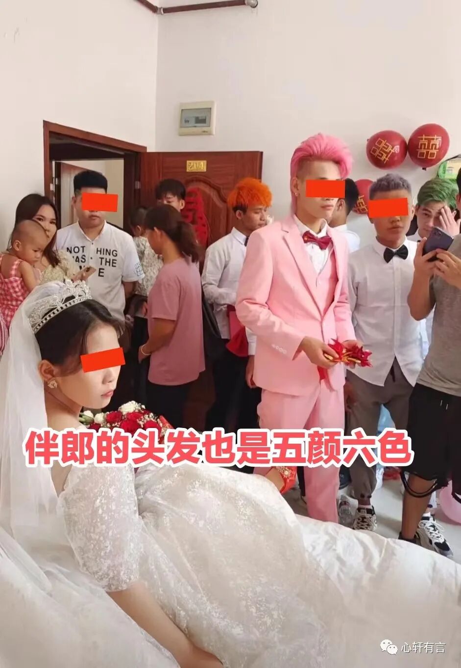 在这场婚礼的当中,除了新郎的头发染成这样的颜色之外,无语的是伴郎的头发也染成五颜六色,赤橙黄绿青蓝紫都有。