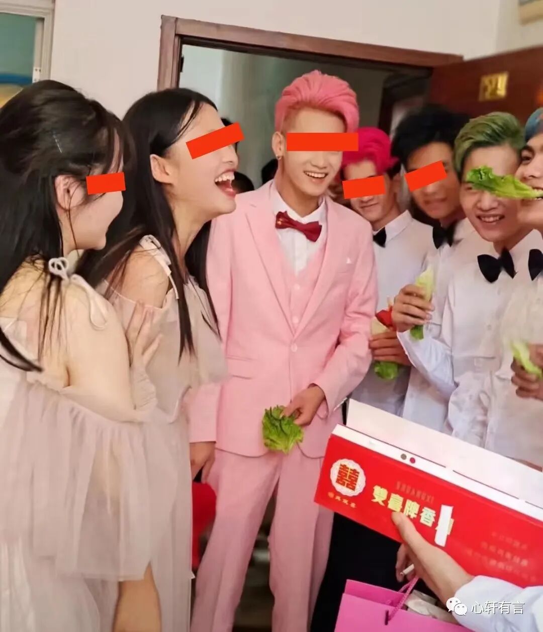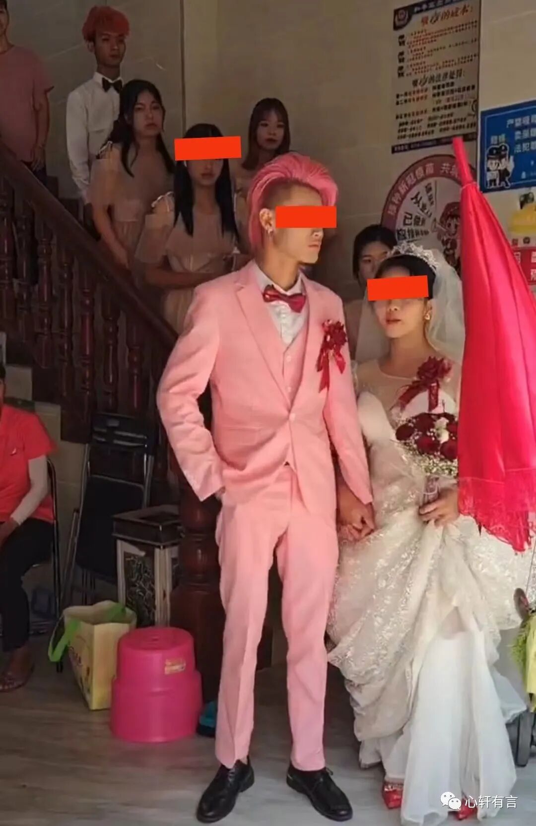 近日,网友爆料,广东云浮一场婚礼,新娘身穿一身白色婚纱,但新郎的装扮有些奇怪,他身着一套粉红色西装,头发同时也染成橙色,如果不是佩戴着新郎的胸花,别人还以为他是街头“浪子”。