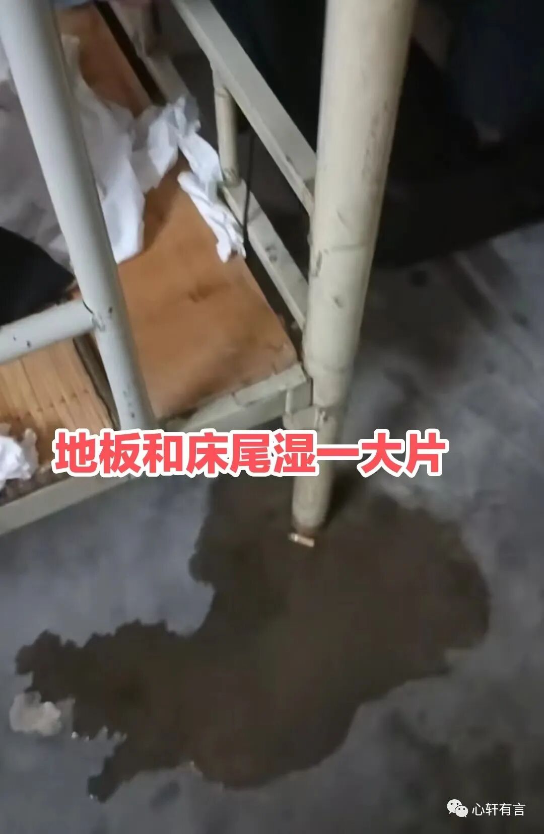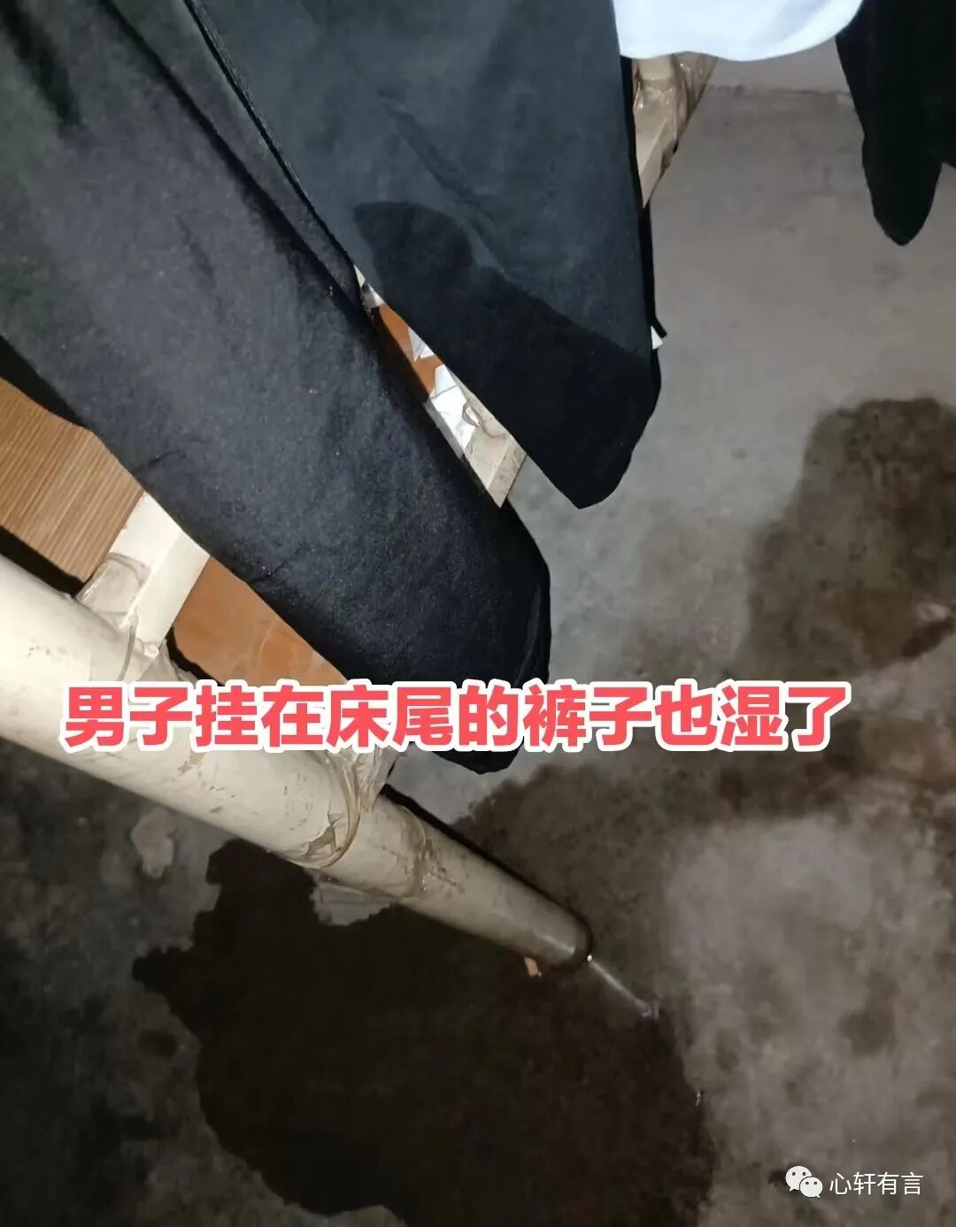 然而,他起床查看之后被惊到,不止床尾湿了,连床尾的地板也湿了,甚至挂在床尾的那两条裤子也湿了一大片。