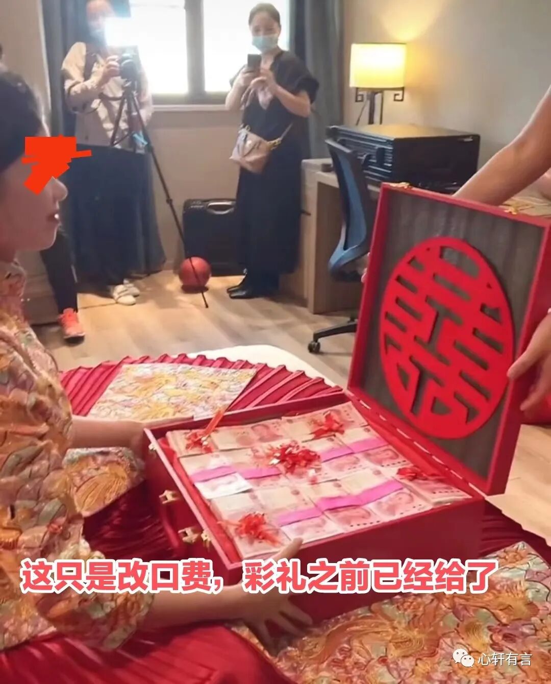 在这场婚礼当中,至于彩礼多少并未得知,但在酒店接亲的时候,婆家却捧着一个红色箱子装着所谓的“改口费”和红包,来接亲。