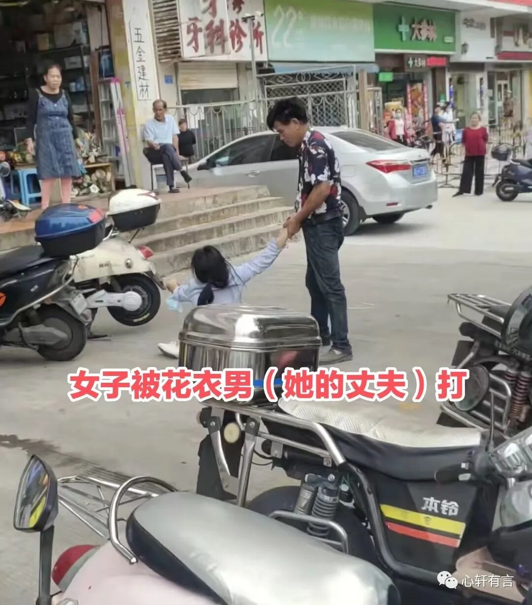 女子被自己的丈夫打倒在地后,有几位路人看不过去,纷纷过去劝架、指责等等。