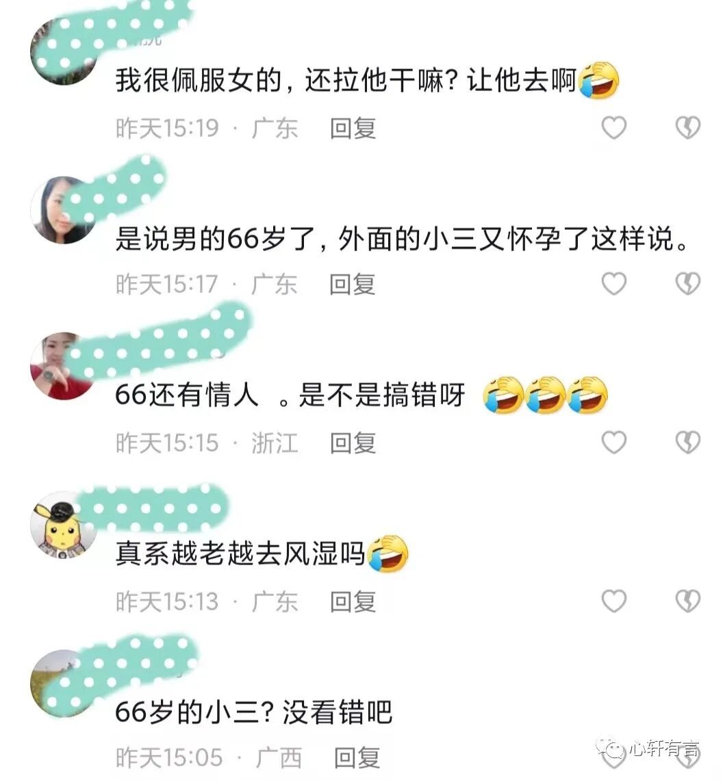 事情原委便是,女子的丈夫背着她在外面有了小三,而且这位小三的年纪已经66岁,但是女子的丈夫却是50多岁,其实不管小三有多年轻,和有多老,但只要背着妻子在外边有情人时,作为妻子是无法原谅丈夫这样的行为。