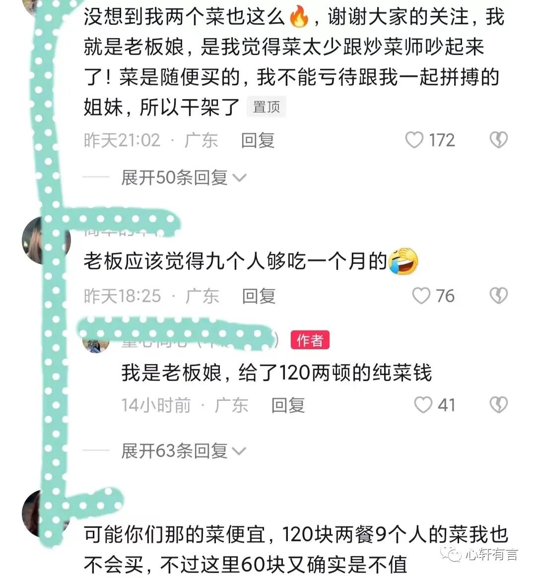 根据这位女老板的自述,她店里面有9位员工,事发当天,她是给120块纯买菜钱给那位厨师去买当天的两顿菜,是纯买菜钱,并没有包括柴米油盐酱醋这些。