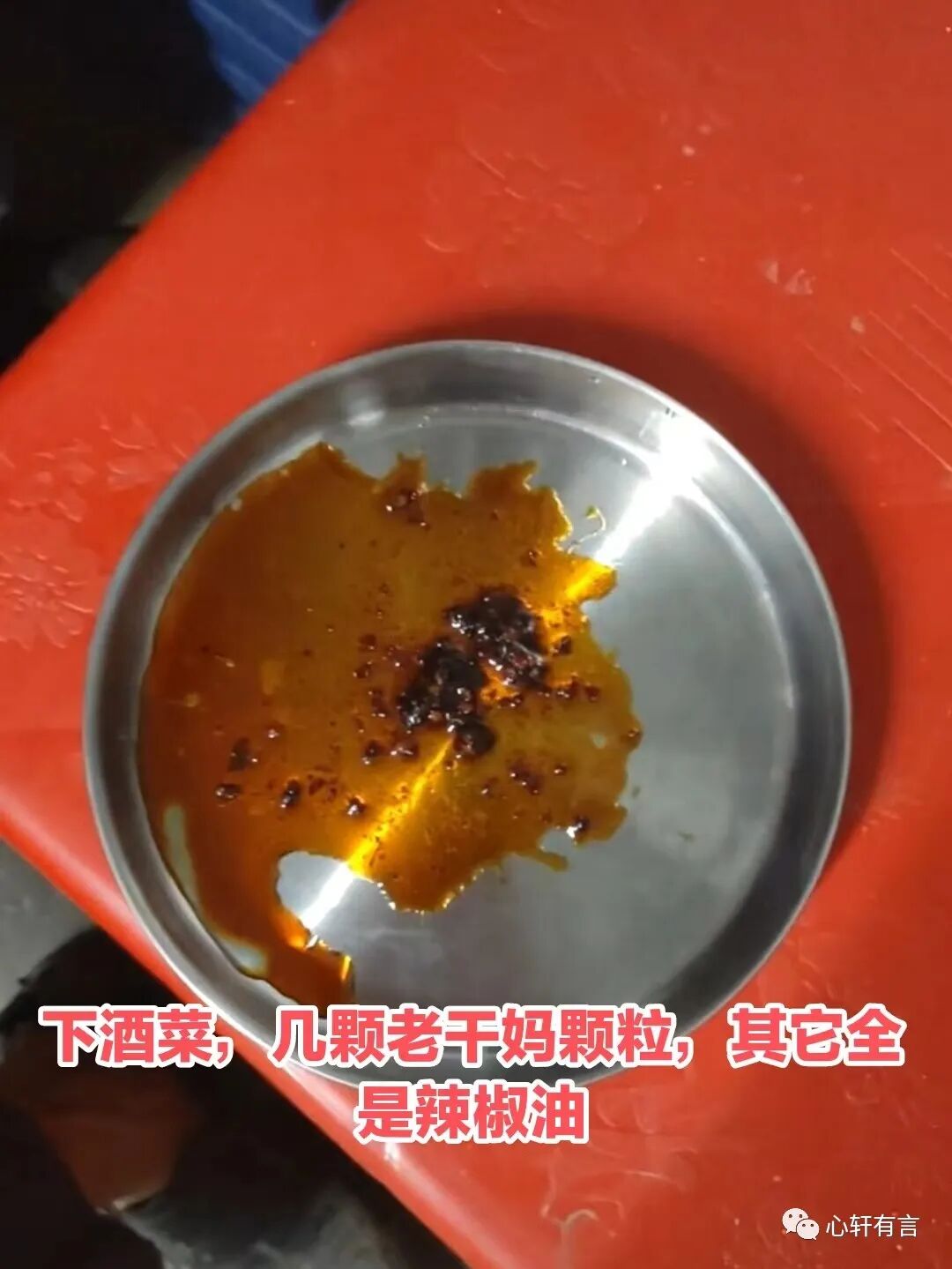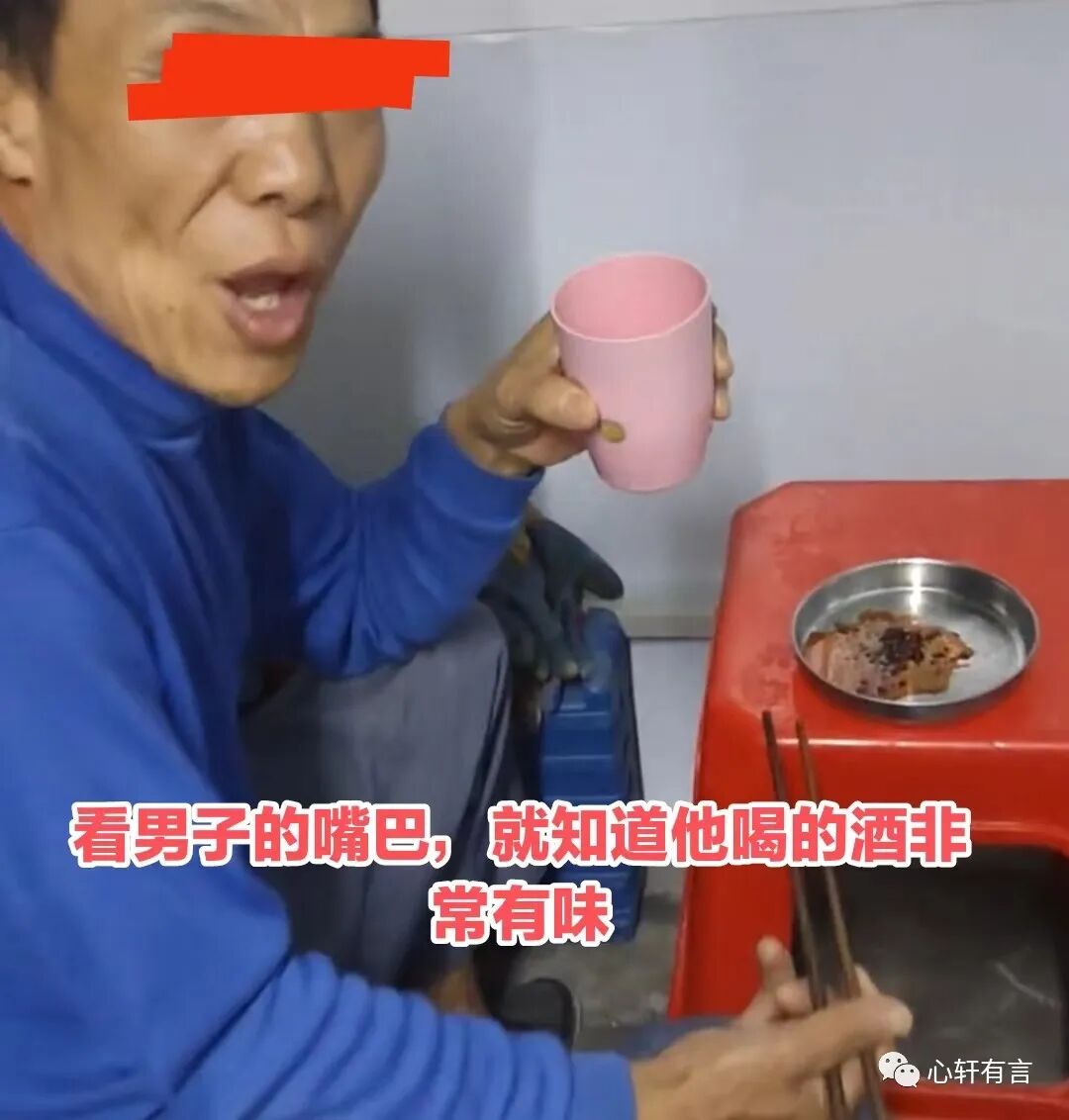 可是,当这位拍摄者镜头拉近之后才发现,这名男子的杯子里面却只盛着一点点白色小米酒,而他的下酒茶却是老干妈。