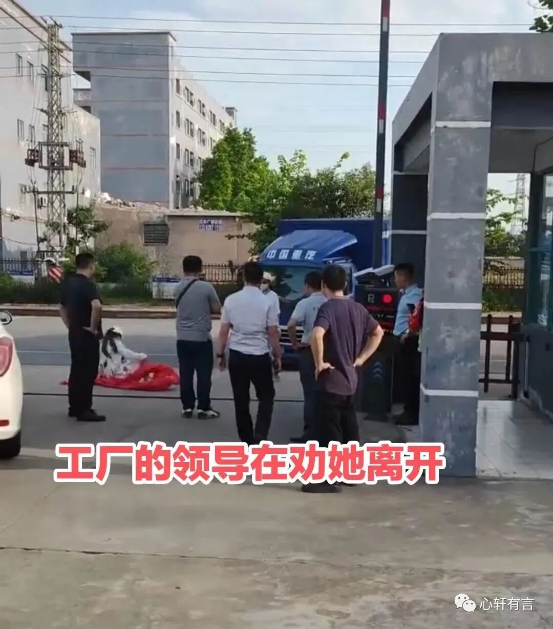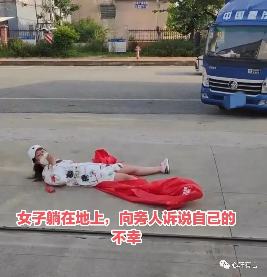而此时的这名女子,已经躺睡在工厂门口的地板上面,无论旁人怎样劝说,她都不起来,进出的车辆也因为她而停在工厂门口里面和外面。