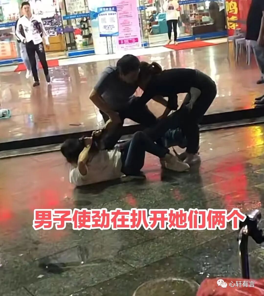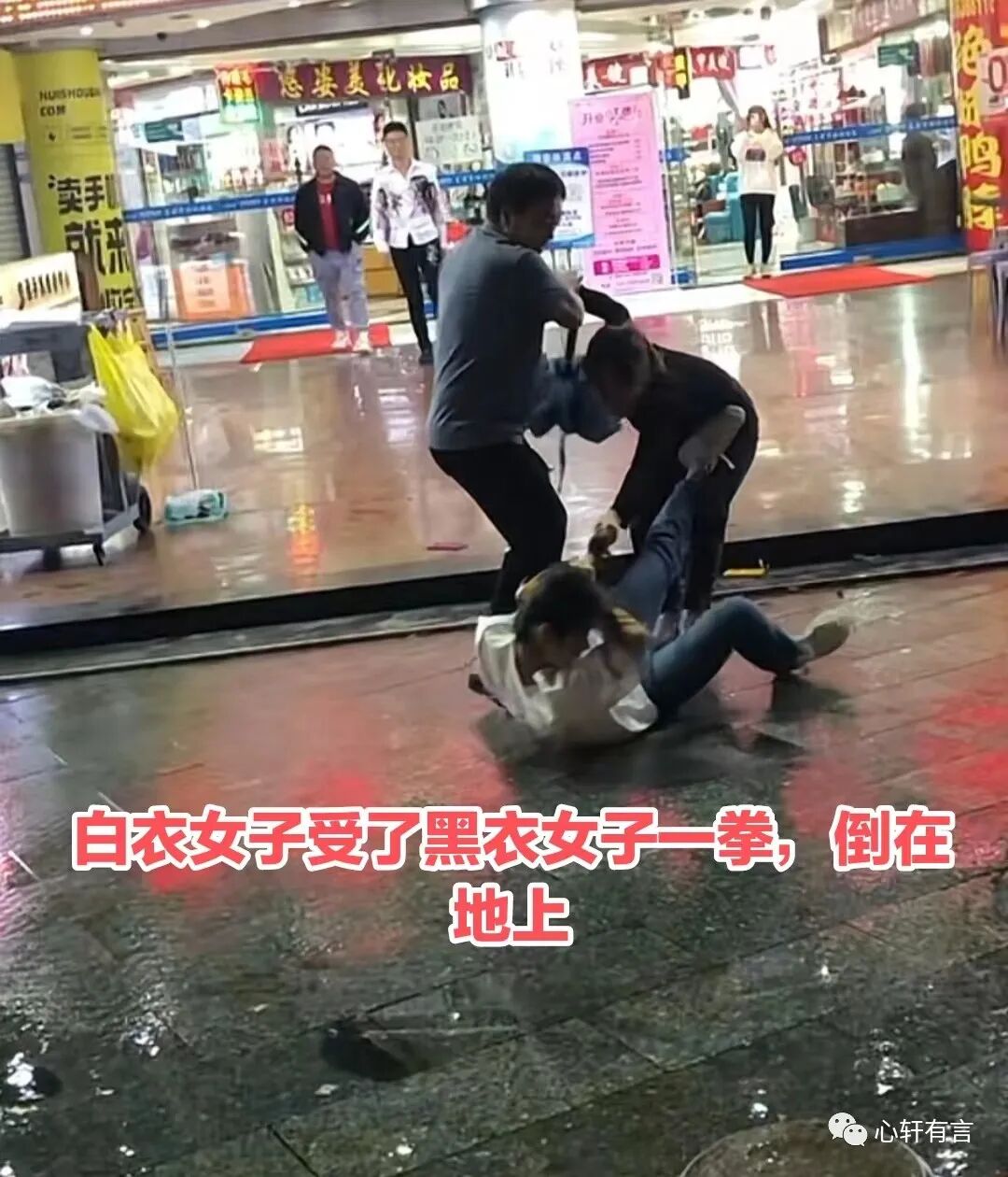 近日,在广东珠海一家购物广场门口,此时天空还下着小雨,地板还很湿,一名女子正在和丈夫的女同学俩个人互相在撕打,而女子的丈夫不管如何解释,如何拉架,都劝不住老婆。