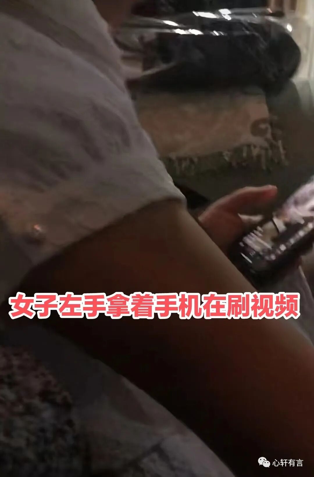 如今看来,女子却自由自在、不拘不束,一只手放在他腿上,而另一只手却在玩手机,完全不顾及男子的感想。