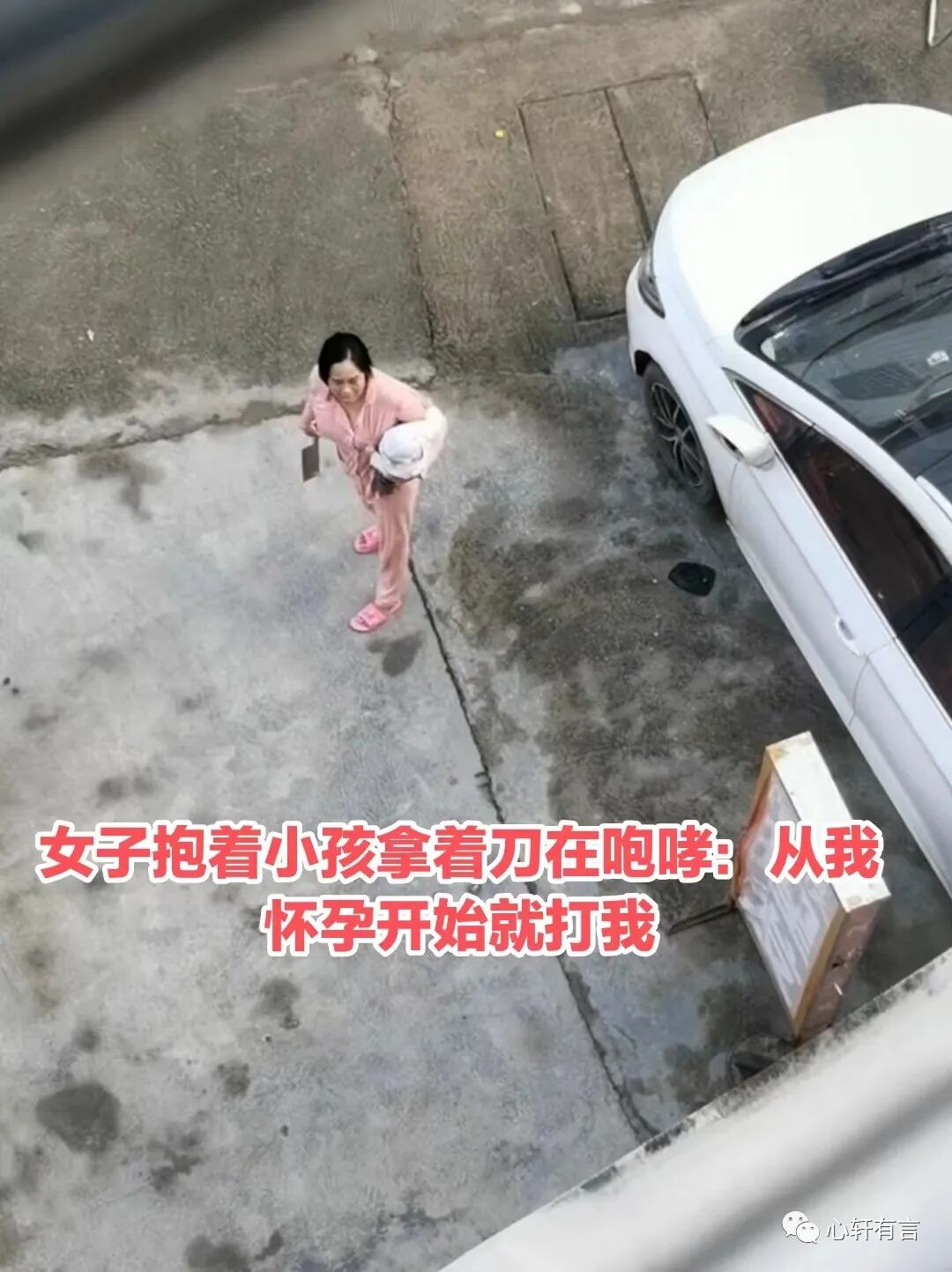 女子在楼下抱着孩了,站在路边手里拿着刀,不停在走来走去,并且还用刀对着楼梯口说,从怀孕就开始打我,你还是人吗?