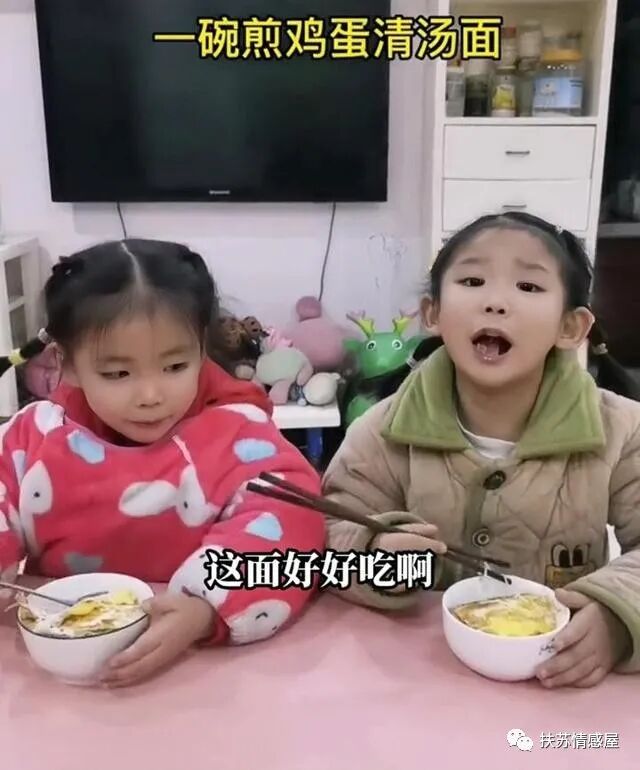 男子看到女儿煮的清汤寡水,就将他们俩叫了出去,重新烧水煮面,又煎了两个煎蛋端给两个女儿。