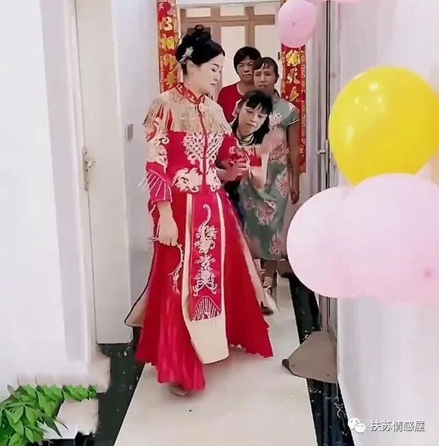 原来新娘家庭有点特殊,从小就父母离异,跟着父亲一起生活,后来父亲干活发生意外,落下了残疾,新娘靠勤工俭学完成了学业。