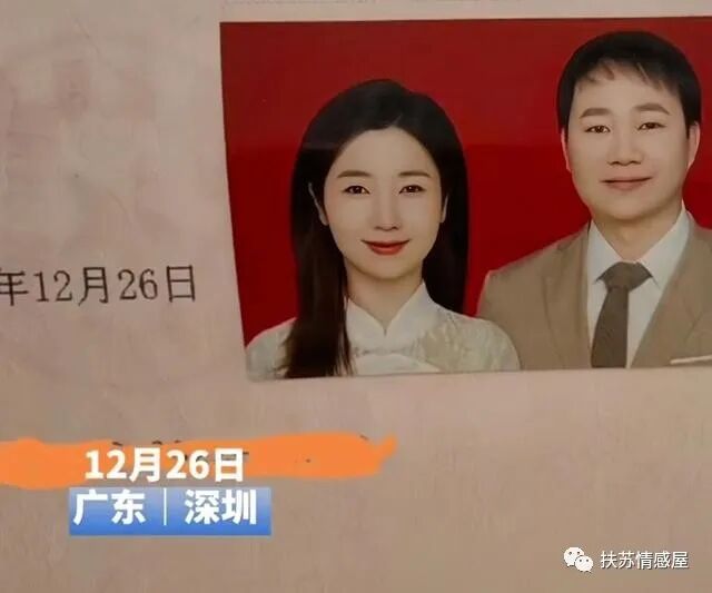 12月26日,两个人就在深圳民政局领取了结婚证,并打算到年底回到家乡摆酒,完成婚礼的最后一步,为特别缘分画下圆满的句号。