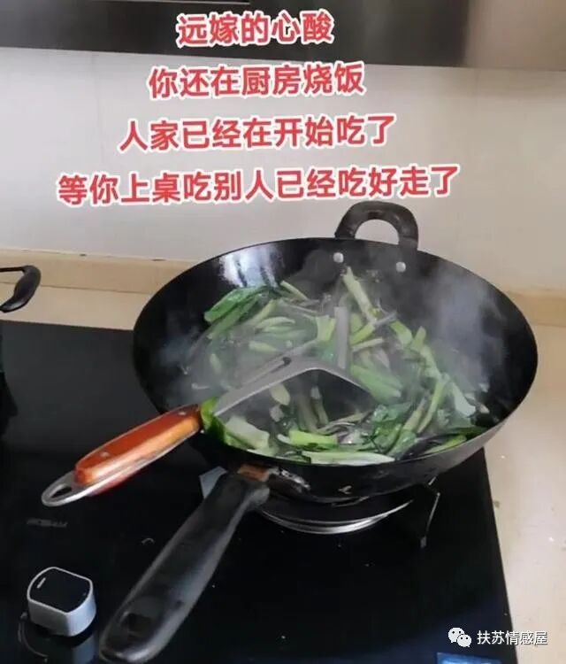 女子炒完菜就端上桌,还剩下一个菜的时候,婆家人就已经开吃了,期间没有一个人叫她,也没有那种想要等他吃饭的意思。