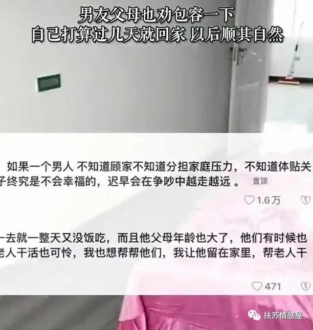 男友的父母年龄也很大了,一把年纪还要做家务,看到他们两个老人干得那么辛苦,也想上去帮忙,他们的儿子却不管不顾。