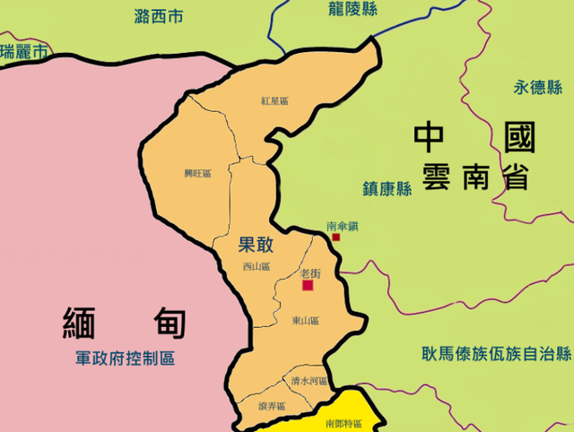 在中国和缅甸交界的交界的地方有一个缅甸掸邦北部果敢自治区,简称果敢。果敢位于掸邦高原上,北面和东面与中国的云南省接壤,总面积约2700平方公里,总人口约25万。