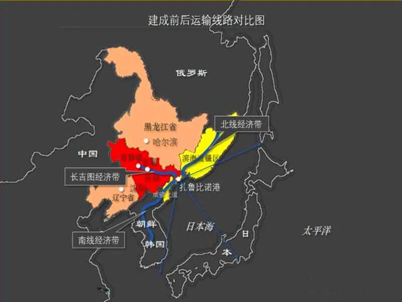 由图们江出海,向北可以到达俄罗斯远东地区的各个港口,向南可以到达朝鲜半岛,向东通过日本海,可以直接到达日本西海岸各个港口,并且可通达太平洋沿岸各国各地区,乃至世界各地,可见图们江出海口是多么重要。